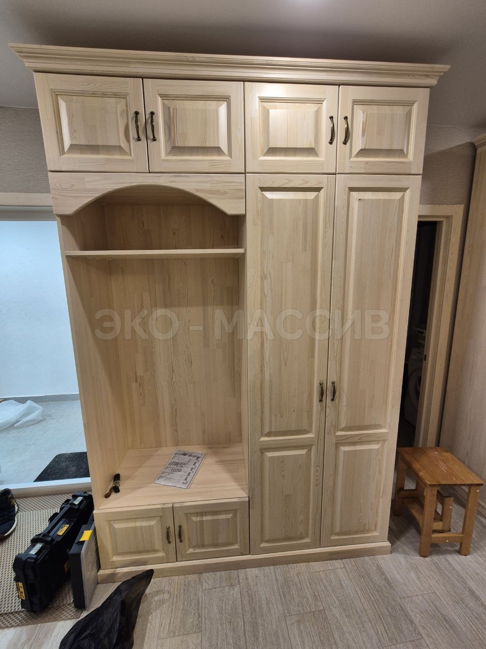 Сосна - щит мебельный сращенный (класс Экстра), задняя стенка: ламинированная ДВП (без доплаты) или фанера в цвет изделия (с доплатой). Изготовление из березы, бука, дуба – с доплатой.